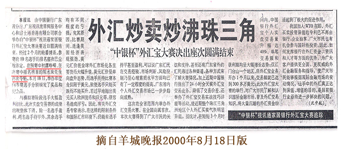 2000年参加中国银行举行的“外汇宝”大赛,预决赛蝉联冠。2002年创办“东方量子基金外汇理财管理(CFP)金融培训班”。